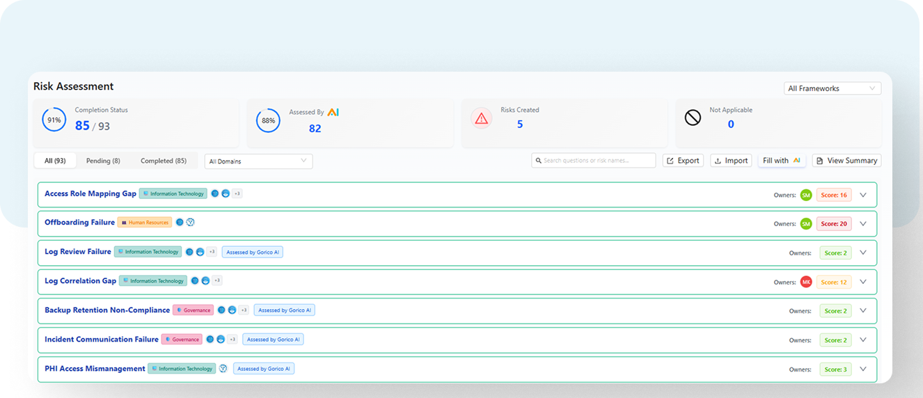 GORICO’s TPRM Agent analyzes vendor SOC 2 reports automatically, extracting key findings and control gaps in minutes. Reduce manual review time and accelerate third-party risk decisions by 2–4 hours per vendor.