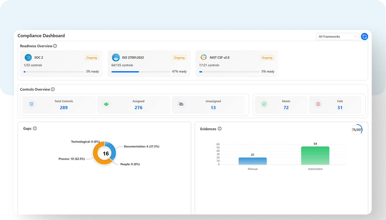 Live dashboards provide instant insight into readiness, control status, evidence progress, and framework coverage across your organization.